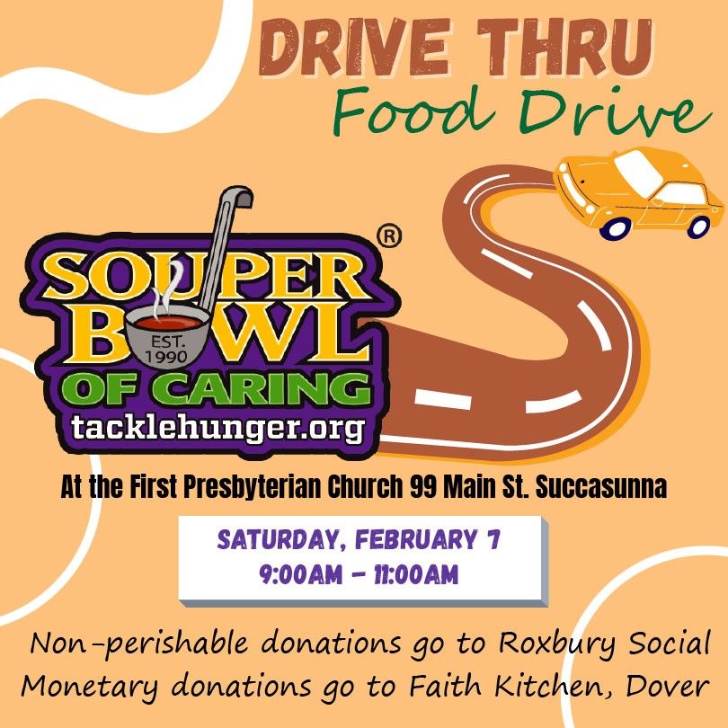 Souper Bowl Drive-Thru Food Drive 🏈🥫 Saturday, February 7 | 9–11 AM Help Tackle Hunger at the First Presbyterian Church of Succasunna 📍 99 Main Street, Succasunna, NJ Load up your car with non-perishable food donations and drive through—our volunteers will unload everything for you! Donations support Roxbury Social Services and Faith Kitchen (Dover). 💵 Monetary donations for Faith Kitchen are also welcome. 🚫 Please no expired items. When you donate, tell us which Super Bowl team you’re cheering for—the winning team will be posted on our Facebook page! The Souper Bowl of Caring has helped fight hunger for over 30 years, and our church has proudly participated for more than 25. Join us and help make this our biggest Souper Bowl yet!